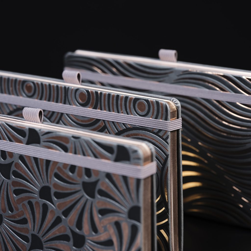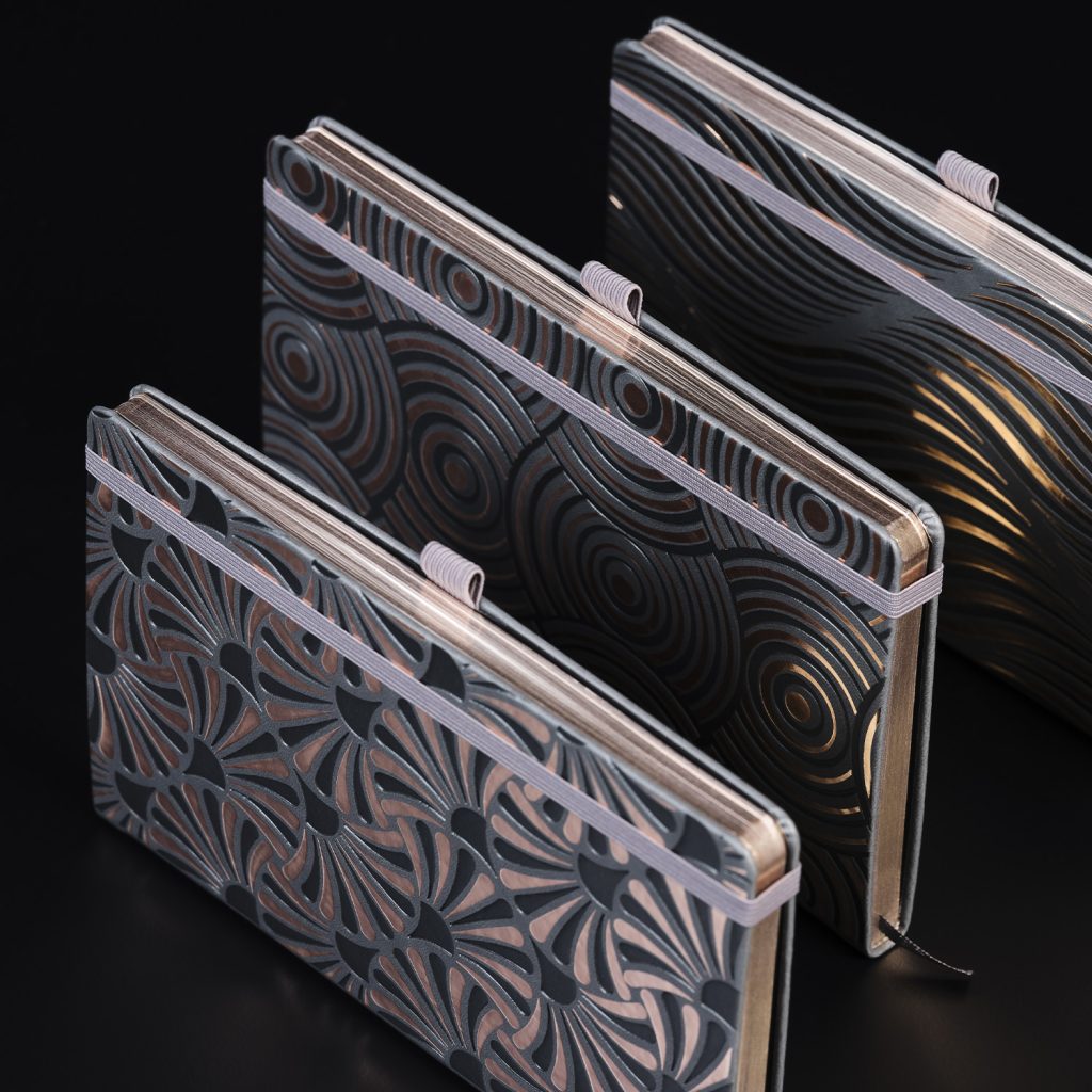 Le copertine di questi taccuini sono realizzate con un esclusivo materiale a base poliuretanica privo di PVC, morbido al tatto e dotato di un effetto termo riscaldante.